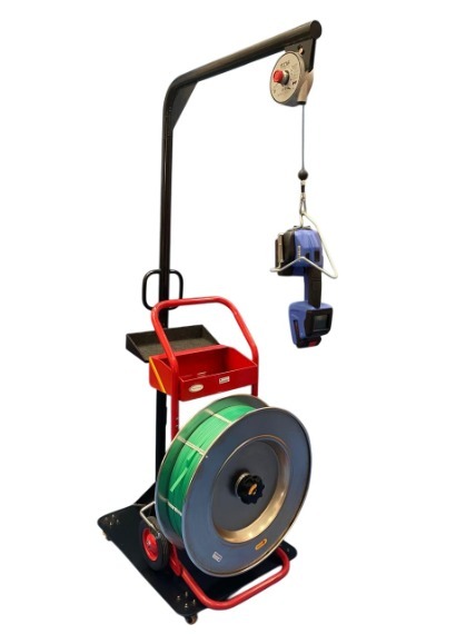 Este dispositivo es una unidad logística integrada diseñada para optimizar el proceso de embalaje manual, puesto de trabajo ergonómico desplazable que combina el almacenamiento del rollo de zuncho con un sistema de compensación de peso para la herramienta.